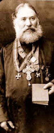 The Galveston parish board additionally purchased a like adjoining property west of the Church doubling the size of the property in early 1900. But, in his 66th year, on September 8, 1900, Galveston Island was hit by the greatest natural disaster in United States history when the massive Hurricane of 1900 came ashore. The Island was almost totally destroyed (est. of 8,000 to 12,000 deaths of a population of 30,000, which included 24 members of the congregation. Fr. Theoclitos and Fr. Mikhail spent 30 hrs in the church praying and giving refuge to parishioners and neighbors that sought safety in the church. After the storm had passed, the church structure was still standing although it had floated to the west about 10 feet, partially onto the additional property just purchased. Those that were with him in the church believed Fr. Theoclitos and his church had truly saved their lives. The congregation gathered and raised the Church, repaired the damage and early in 1901 petitioned Bishop Tikhon, who had since moved the headquarters of the Diocese to New York, to visit and reconsecrate their repaired Church. Bishop Tikhon accepted and arrived shortly before services on June 3, 1901. By order of Tsar Nicholas II, Bishop Tikhon bestowed on Fr. Theoclitos the Royal Honors of (1) the Order Of St. Vladimir and (2) the Order of St. Anne (in his picture, the ribbon and cross like medallion around the neck to his right side is the order of St. Vladimir, the ribbon and medallion around the neck to his left side is the Order of St. Anne and the necklet with the large medallion was awarded him upon attaining his Graduate Degree in Theology from the Moscow Theological Academy).